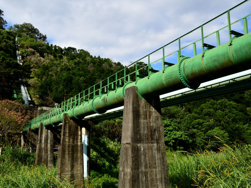 水管橋等点検は、河川や軌道を横断する水管橋および橋梁添架管の機能維持を図るため、定期的に漏水の有無や塗装の状況、付属設備の状況等の点検を行い、必要に応じて補修を実施するものです。 蓄積された点検情報は、水管橋等の点検計画の見直しや修繕・更新計画立案の際に活用することができます。